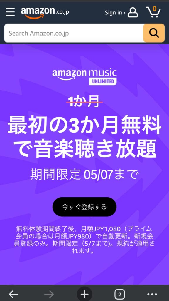 Amazon music unlimitedが3か月間無料になる。