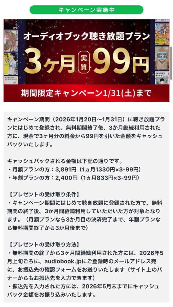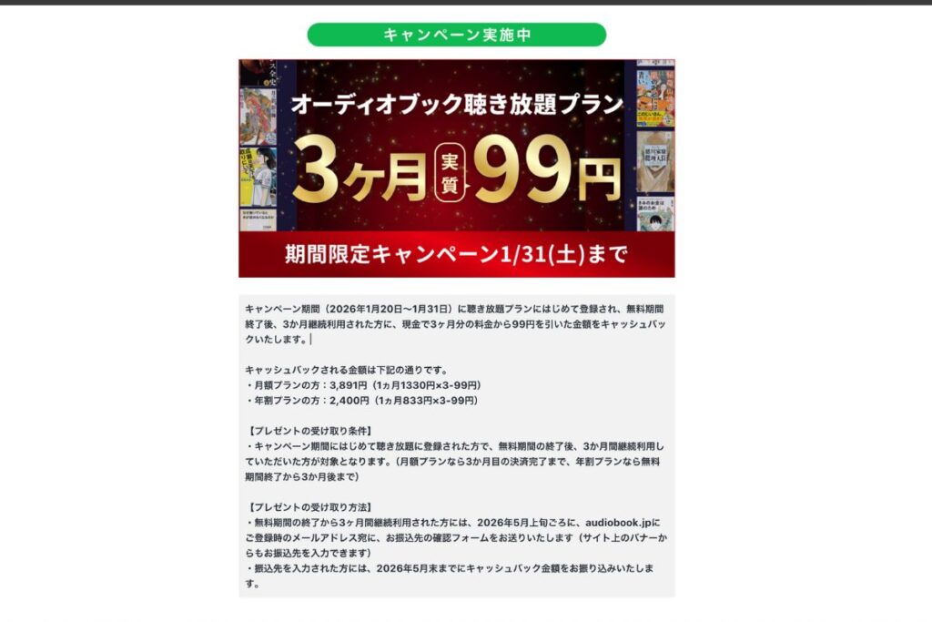 キャンペーン期間(2026年1月20日~1月31日)に聴き放題プランにはじめて登録され、無料期間終了後、3か月継続利用された方に、現金で3ヶ月分の料金から99円を引いた金額をキャッシュバックいたします。