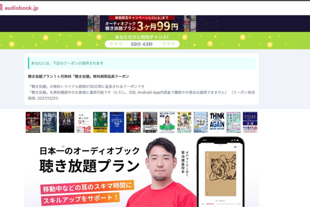 当ブログの読者限定で、audiobook.jp聴き放題ブランの無料体験が、通常の14日間から30日間に延長されます!